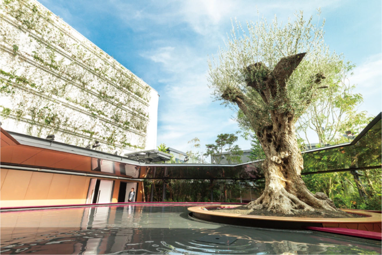フランスパビリオンの中庭に移植された巨大なオリーブ。見る人を圧倒する。