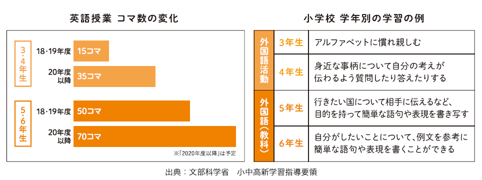 早期英語教育の流れは、小学校教育にも現れている。2020年度から実施される小学校の新学習指導要領では、英語が5、6年生で教科化され、簡単な英語を使い体験的に英語に親しむ「外国語活動」が3、4年生から開始されることが決まっている。