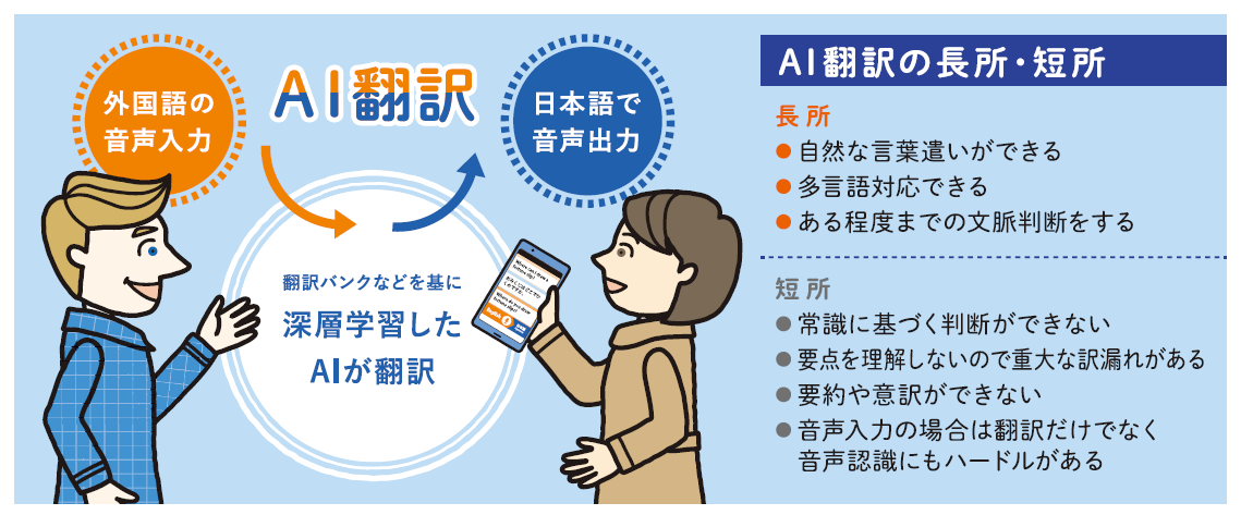 AIを活用した翻訳は、単語から意味を連想して訳を考えることができる。さらに文章の特徴を自ら分析して学び、訳に生かす「深層学習」もできる。グーグルが2016年にAI翻訳をインターネット上の翻訳サービスに導入して一般に広まった。